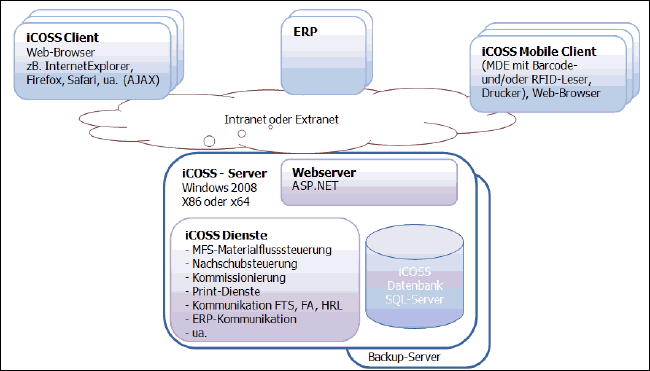 Als iCOSS-Mobile-Clients werden MDE-Geräte und/oder Staplerterminals unterstützt - einzige Voraussetzung: Web-Browser. Die Anbindung erfolgt via WLAN/Datenfunk. |